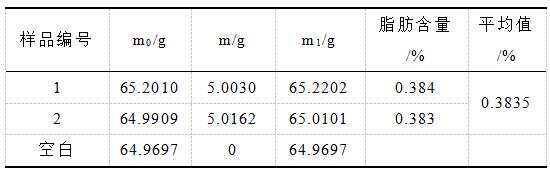 由表中數據可知,采用那艾儀器脂肪測定儀測試的掛面樣品中兩個平行樣數據的重復性符合國標GB/T14772-2008標準,即掛面樣品的脂肪含量為0.3835%。